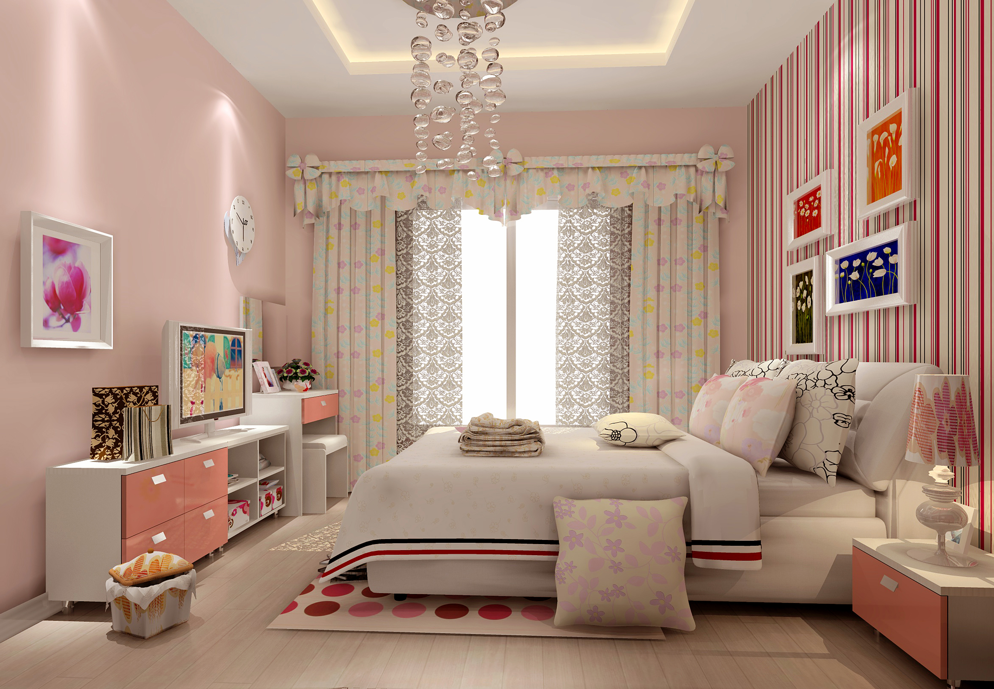 臥室的功能主要是睡覺、休息,繁雜的裝飾會讓人思緒復雜,且心情煩躁,不利于休息。另外,臥室屬私人空間,不向客人開放,所以臥室裝修也沒有必要有過多的造型,通常也不需吊頂,墻壁的處理越簡潔越好,通常刷乳膠漆即可,床頭上的墻壁可適當做點造型和點綴。臥室的壁飾不宜過多,還應與墻壁材料和家具搭配得當。